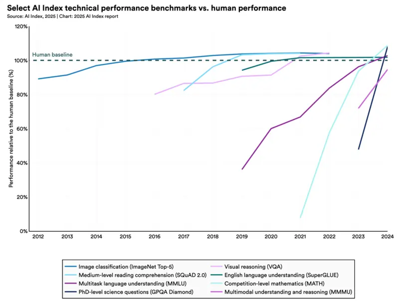 Il report AI Index 2025 della Stanford University fotografa bene il paradosso: ci sono modelli capaci di risolvere problemi da olimpiadi di matematica che però faticano su compiti di ragionamento più complessi nel mondo reale.